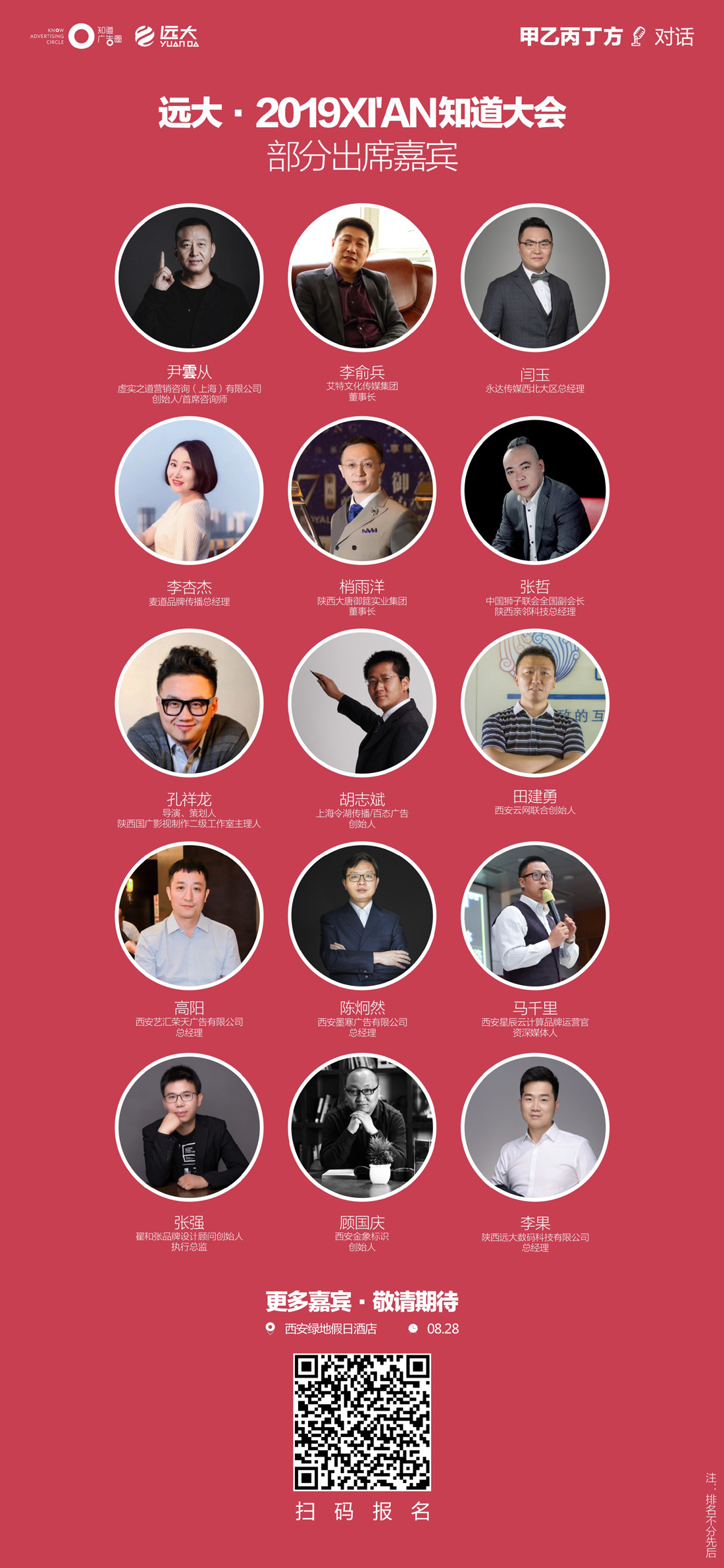 本次活动是由知道广告圈主办,中国商务广告协会广告工程分会和西安市中小企业协会特别指导,陕西远大数码科技有限公司独家冠名,西安艺汇荣天广告有限公司联合主办,西安宇奇标识协办;感谢上海虚实之道/亚洲户外/麦道/陕西大唐御筵实业/翟和张品牌定位/西安角度广告/西安金象标识/百态广告/陕西国广影视/西安云网/西安星辰云计算/快手陕西/星空375·西凤酒/视立美陕西/陕西神采飞扬传媒/陕西亲邻科技/兰州唯斯特品牌设计/思佰特文化/西安欧众设计等公司对于本次大会的特别支持;感谢知道大会战略合作伙伴广告链/八戒陕西/集约控股/西安设计+/发声设计演讲/共享摄/印之家/箱盒汇/亦以歌/萌新运营苑/秦领会/One Talk/合市佬/樊登读书会/西安市中小企业协会搭建租赁委员会/三力会展/平面帝国/;感谢大会礼品支持单位长安客·西凤酒/花田巷子/冰峰/戈壁爸爸/小航定制/西安西凯广告/易凯管理软件/西安文官花生物/喜神米酒/厚珍源/惟颐;感谢大会媒体支持单位:一点资讯/搜狐西安/西安同城/陕西一代天骄文化传播有限公司/未来鲜森/广告行业黄页/广告邦/西安新动向广告。