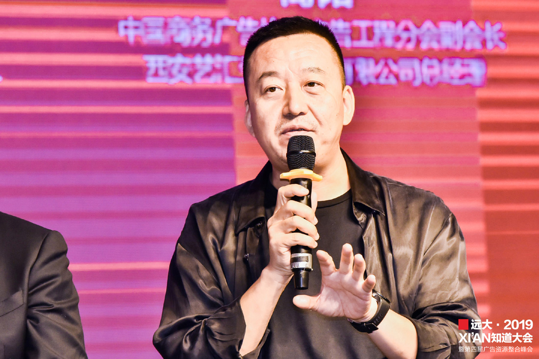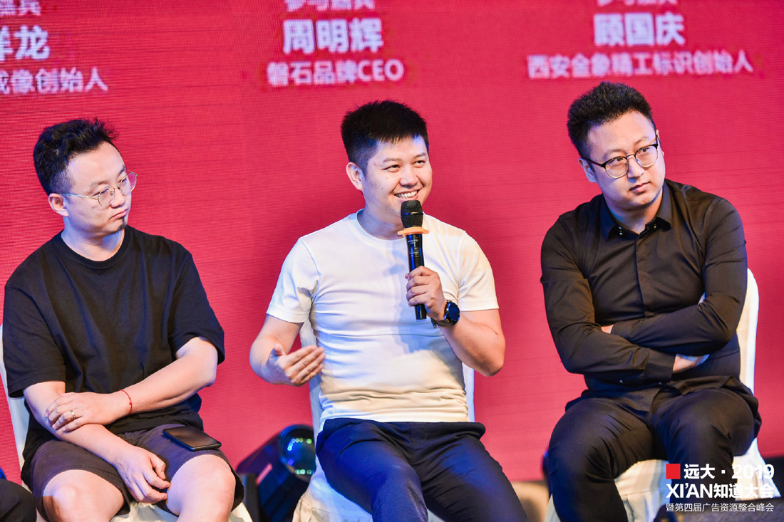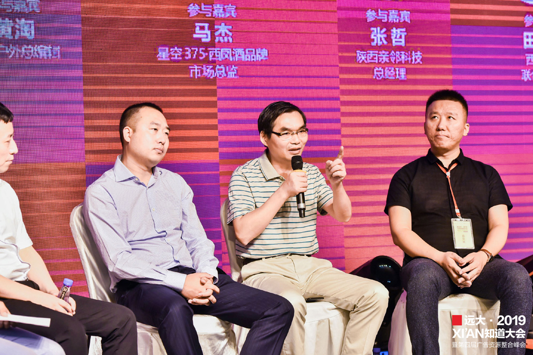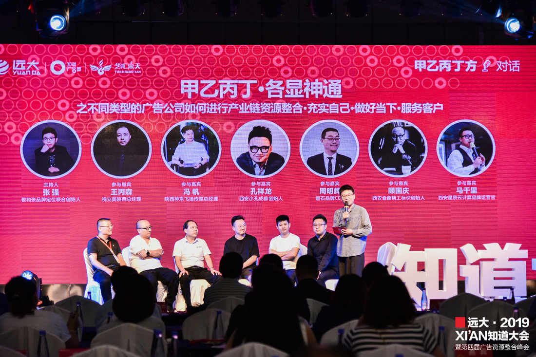 翟和张品牌策划定位联合创始人张强携视立美陕西公司总经理王丙森、西安金象标识总经理顾国庆、陕西神采飞扬传媒总经理冯帆、陕西国广影视制作有限公司二级工作室主理人孔祥龙、磐石品牌创始人周明辉、西安星辰云计算品牌运营官马千里,共同就《甲乙丙丁·各(共)显神通》之不同类型的广告形式之间如何资源整合、做好当下、充实自己、服务客户进行对话。